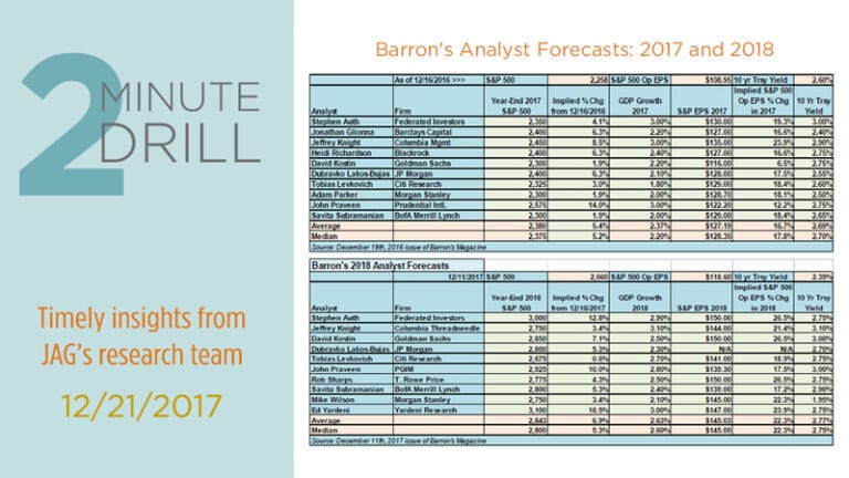 On average, the 10 analysts polled by Barron’s this time last year predicted the S&P 500 to rise only 5.4% in 2017. Whoops! As is often the case, the smartest folks on Wall Street proved they can be fallible. While they correctly predicted the general direction of stock prices (up), they did not come close to foreseeing the magnitude of gains we have experienced this year. Understand that we are not maligning investment strategists. They are almost uniformly intelligent, dedicated, and hard-working professionals. Unfortunately, they have all been trained and educated similarly, and they tend to rely upon almost identical data to inform their forecasts. Consequently, their market predictions tend to be tightly grouped with one another. So, it should come as no surprise that their 2018 are again clustered around “up a little” prediction for stocks. The Barron’s 2018 Analyst Survey’s average prediction calls for a roughly 7% gain for the S&P 500 next year. If history is any guide, the market is likely to either undershoot or overshoot this consensus expectation.
