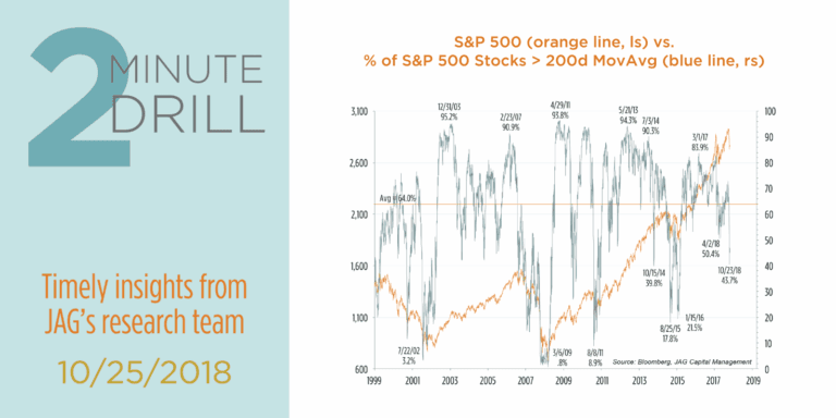 There is an old saying that describes market behavior: “Stair-steps up, elevators down.” In other words, when stocks are rising, they tend to do so in a slow and steady manner. But declines and corrections tend to be much sharper and swifter. So far, October 2018 is turning into Exhibit A for this dictum. The S&P 500 is now almost 7% off its September high’s. According to Bespoke, more than 17% of S&P 500 stocks traded at new 52-week low’s on October 24, the highest percentage since February 2016. Similarly, as our chart shows, less than 44% of S&P 500 members are trading above their 200-day moving averages. By this metric, the current pullback is more painful than the one we experienced earlier this year, and is the worst since early 2016. Outside of major bear market bottoms like 2002 and 2009, the current levels tend to be supportive of market recoveries. Our takeaway: we think the market could be preparing to build a shortto intermediate-term base as we finish out 2018.