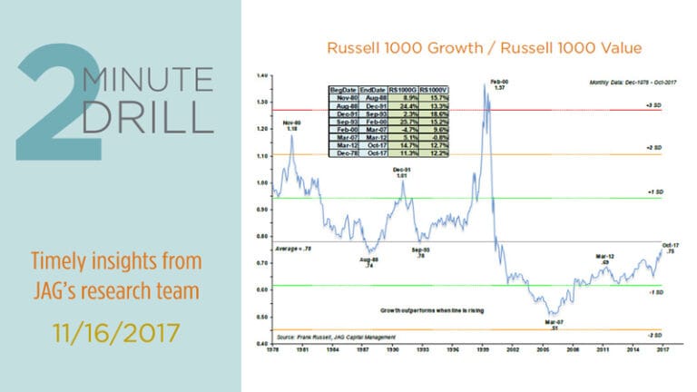 So far this year, the Russell 1000 Growth Index has more than tripled the return of the Russell 1000 Value Index. (26% vs. 8%, year-to-date through 11/14/17, respectively). Given this vast recent outperformance by growth stocks, some Wall Street strategists are predicting that the worm will turn in 2018. They think that mean reversion will come to the rescue of value stocks, which could lead to value outperforming growth over the coming year.