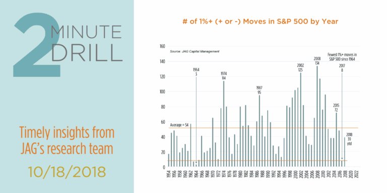 Since 1954, the S&P 500 has experienced an average of 54 daily moves of a least +/- 1% or greater moves each year. But since 2016, volatility has been lower. In 2017 there were only 8 daily moves of at least +/- 1%, the fewest since 1972. While it is true that 2018 has been much more volatile than 2017, note that the market is still experiencing below-average price volatility compared to the past 6+ decades of history.