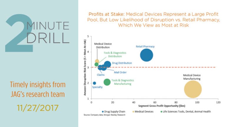 As anyone who has ever examined an Explanation of Benefits (EOB) form knows, the delivery of health care services in the United States is rife with friction and complexity. A typical prescription passes through several hands – each of which extracts a fee – before ever reaching the patient. The abundance of middlemen involved in delivering health care is ripe for disruption. Morgan Stanley Research put together this bubble chart juxtaposing margins and profits of various health care industries against their assessment of the risk of disruption by Amazon. They view medical device manufacturers as being at low risk of disruption, but retail pharmacy is another story altogether. We think Morgan Stanley is spot-on here, and we expect Amazon to target that big fat Pharmacy profit pool in the coming years.