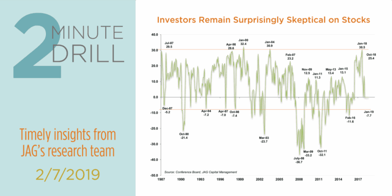 Stocks have rallied more than 15% since Christmas Eve, but investors are still feeling bruised by the brutal near-20% correction late last year. According to the January 2019 Conference Board Survey, 38.6% of respondents expect stocks will decline in the coming year, compared to 30.9% who expect stocks to rise. To put it another way, bears were 7.7% more common than bulls in the most recent survey.