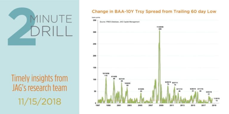 The current correction in stocks began in late September and accelerated into late October, and it brought the S&P 500 down as much as 9.5% in the process. These charts show the path of yield spreads for both BAA-rated (investment grade) and CCC-rated (“junk”) bonds over the past 20+ years through November 9. Perhaps unsurprisingly, both charts show that yield spreads have recently widened along with equity market volatility. But importantly, we note that spreads have thus far remained much more subdued than in prior corrections in 2011, 2012, 2014, and 2016. We will be watching this data closely over the next several weeks. If the widening in yield spreads remains contained, we think the odds would favor continued stabilization in the broader stock market averages. On the other hand, if spreads widen dramatically, it is likely that stocks will have a rougher go of things in the near/ intermediate-term.
