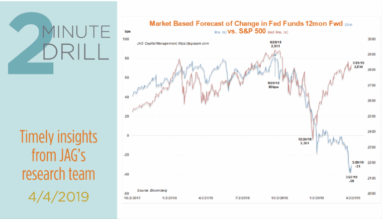 Including the most recent .25% increase in December 2018, the Fed has hiked rates nine times over the past three years. Furthermore, as late as early October of last year, the Fed was indicating that future rate hikes were likely to occur into 2020. While the Fed heavily influences short-term bond yields via their power to set the Fed Funds rate, market forces set equity prices, intermediate to – long term Treasury bond yields, credit spreads, currency exchange rates, and a variety of other tradeable instruments. In other words, investors and markets get to “vote” on central bank policies. Late last year, investors began to signal that the Fed’s hawkish tone on interest rates was wrong-footed. Stocks sold off by almost 20% between late September and late December, and credit spreads widened materially. By early January, bond investors were demanding 64 basis points more yield to finance BAA-rated bonds than they had during the first week of last October. This was the biggest 60 trading-day increase in investment-grade credit spreads since late 2011, and it translated into much higher costs of debt capital for domestic corporations. In effect, the markets tightened financial conditions all by themselves, and in doing so they did much of the Fed’s heavy lifting for them. While we have no special insight into the mindset of Fed Chairman Powell or his colleagues, their recent comments have downplayed the prospects for further rate hikes in 2019. What a difference a few months make. The chart above shows that markets are now expecting the Fed to ease over the next twelve months. We think this dynamic has contributed to the strong rebound in stock prices so far this year. More importantly, we think the Fed would be correct to keep future rate increases on hold in the coming months. After all, inflation remains subdued, the US and China remain embroiled in contentious trade negotiations, and the pace of global economic growth is slowing. In our opinion, this is not the type of environment that would indicate an aggressive or hawkish Fed policy.