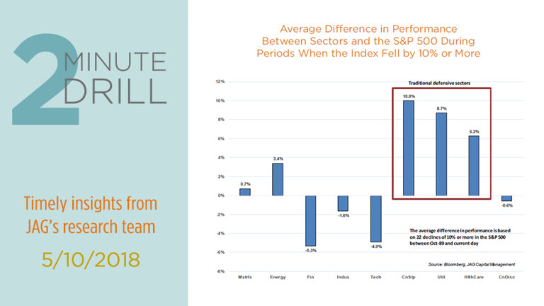 Where do stock investors tend to go when they feel the need to play defense? For the last three decades, Consumer Staples, Utilities and Health Care sectors have been relatively safe ports during market storms. All three groups have generated significant outperformance when the broader market has fallen by at least 10%. Of the three, only Utilities have followed the historical script during the most-recent correction. At least in terms of the so-called “risk off” trades, the market has largely flipped the script so far in 2018.