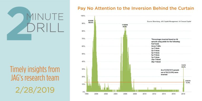 Traditional wisdom says that investors should head for the hills as soon as the yield curve inverts. As you can see above, of the 36 treasury yield spreads calculated, just 5 (or about 14% of the overall curve) are currently inverted. Despite this warning sign, investors continue to bid stocks up in 2019. In fact, the partial inversion is getting almost no attention from financial pundits on television or social media. We think there are 2 reasons that investors are largely ignoring the inversion. 1) The extent of the inversion isn’t enough to set off an alarm for most investors and they’re happy to let the market rebound from December 2018 lows. 2) It has become increasingly clear over the last decade (and especially since Jerome Powell has taken over) that the Fed will be flexible and accommodative when needed. We see no reason for that narrative to change based on recent market friendly actions by the Fed.