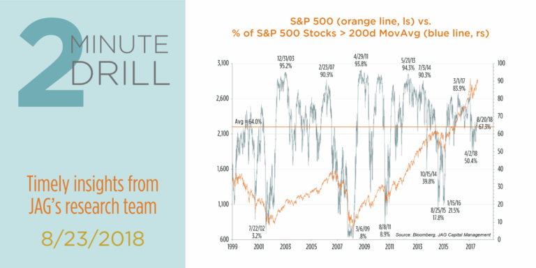 Some bearishly-inclined market commentators are making the case that equity market participation has narrowed in recent months. Their narrative holds that FANG-type stocks have continued to garner an abnormal amount of investor focus, and that most non-FANG stocks are not participating in the upside. The market is becoming uncomfortably narrow. We beg to differ, and in fact we find little evidence that market participation is unusually narrow or weak. Case in point: this chart measures the percentage of S&P 500 members above their 200 day moving averages. As one can see, the current reading of 67.3% is only marginally above its average since 1999, meaning that market participation is neither particularly broad or narrow from a historical standpoint. It is true that extremes in this indicator have often worked well as a contrary indicator in the past. Very high readings have often preceded short-term peaks in stock prices, while extremely low readings have often presaged short-term bottoms. However, non-extreme readings on either side of average – like the one we have now – have tended to accompany rallies in the S&P 500.