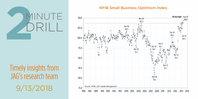 According to the latest National Federation of Independent Business (NFIB) survey, small business owners are the most optimistic they have ever been, eclipsing the index’s previous all-time high of 108 – which was set during the Reagan Administration way back in 1983. This data, combined with GDP growth projections of 4%+, provides a counterpoint to those who complain that the “real economy” remains sluggish. NFIB considers small business optimism to be a leading indicator, pointing out that this index moved sharply higher in November 2016. Back then, the spike in optimism preceded a doubling in the rate of GDP growth between December 2016 and February 2017. The NFIB describes their typical member as a company employing 10 people and generating roughly $500,000 in annual sales. In our opinion, the fact that these types of “mom & pop” businesses are feeling good is evidence that the Main Street is sharing in the benefits of economic strength.