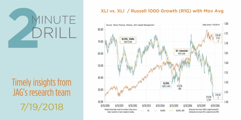 The Industrials sector has been lagging the Russell 1000 Growth Index badly so far in 2018. In fact, the Industrials Select Sector SPDR (XLI) recently made a 2,344 day low in relative strength, which equates to its worst relative performance in over 10 years. At first (and even second) glance, this makes little sense. After all, the economy is robust, corporate taxes are lower, and valuations appear relatively reasonable throughout many of the sector’s constituents. So what ails this cyclical, manufacturing-heavy group? We think investors are penalizing Industrials because they are facing an unappetizing “triple threat” of tariff threats, a strong dollar, and rising input costs.