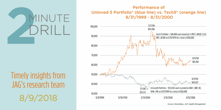 In the fall of 1999, if you were given the opportunity to own $10k each of the “Tech5” stocks or the “Unloved5” stocks, which would you have picked? Given that the Nasdaq had gone up ~500% from 1995 to this point, we think most would have felt pretty good about owning the Tech5 portfolio. Looking a year out, buying $50k of the Tech5 would have been the correct decision. Even with the painful correction from the end of March to August (down 31%) your Tech5 portfolio would have returned 30% vs. an 18% loss for the Unloved5 portfolio. So yes, the correction would have been extremely painful to hold through, but you would have come out with a 30% gain in 12 months. It’s always important to keep things in perspective.